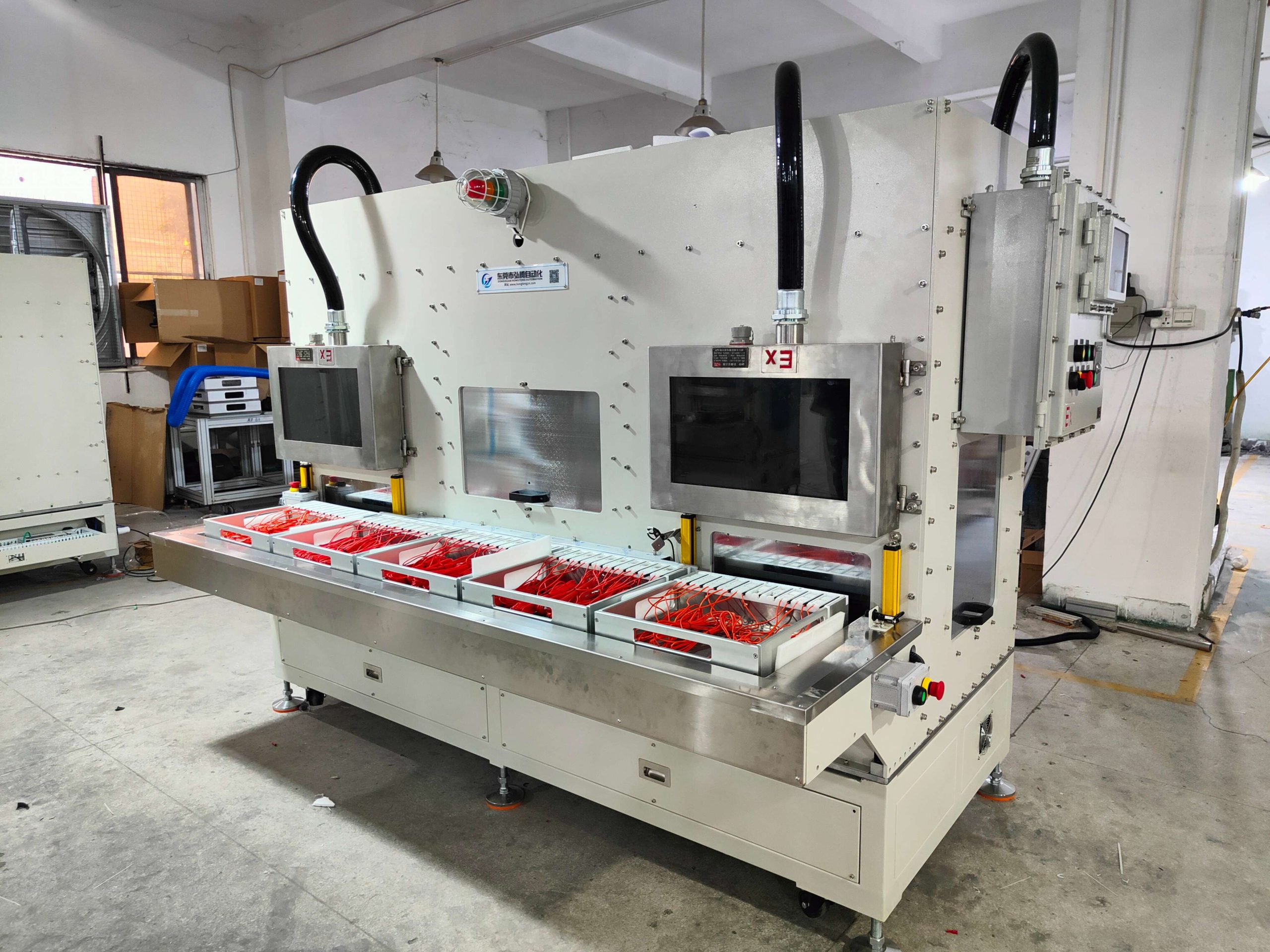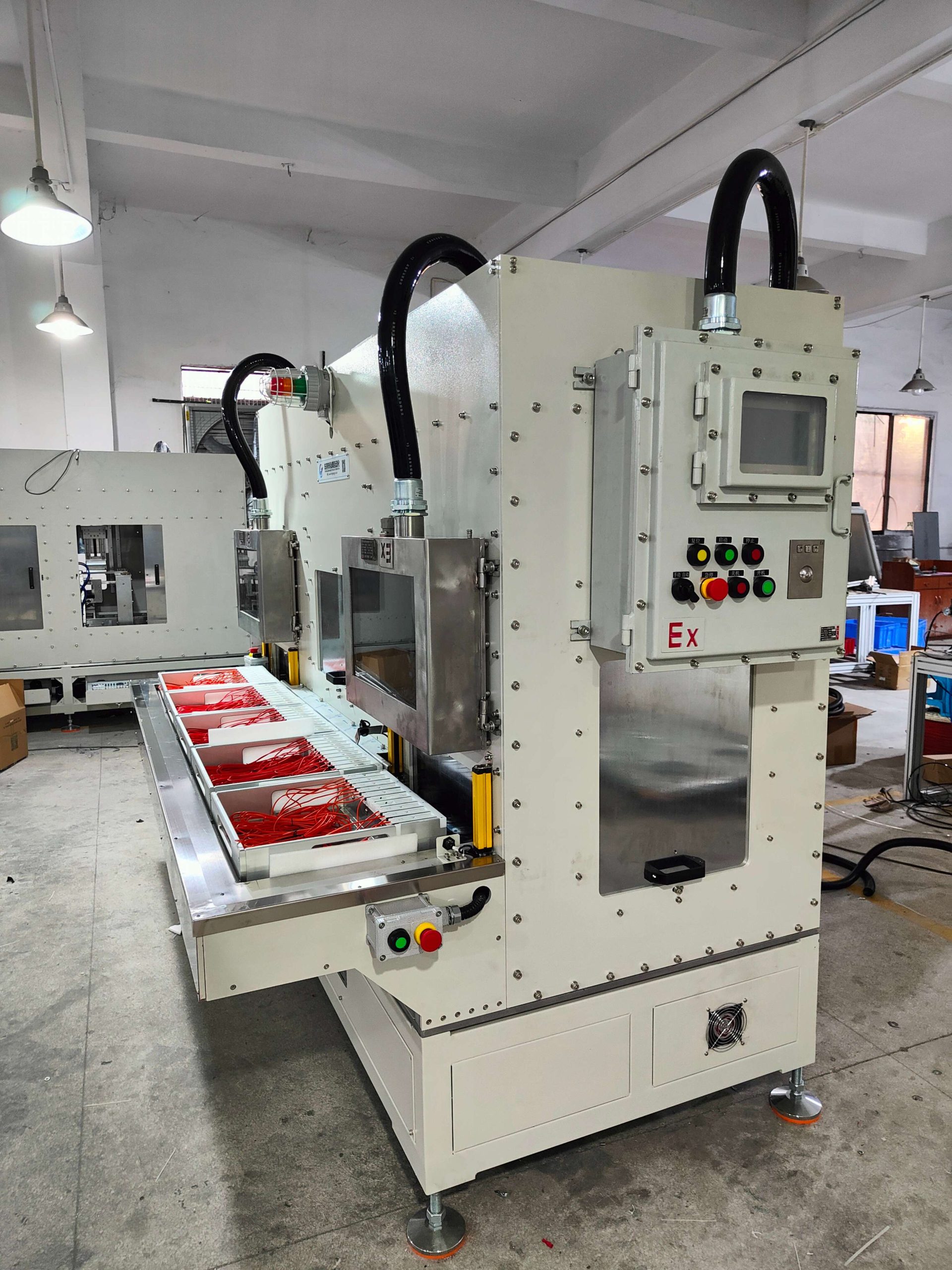 我公司自主研發(fā)的十發(fā)三碼綁定設(shè)備,設(shè)備可單次10發(fā)電子雷管同時進行三碼綁定,效率是普通三碼綁定設(shè)備的10倍,極大的提高的電子雷管三碼綁定的效率。該設(shè)備采用隔爆設(shè)計,所有危險工序全部在隔爆區(qū)域內(nèi)完成,工作人員不接觸危險工序,安全可靠。同時,設(shè)備內(nèi)部裝有高清防爆攝像頭,能夠?qū)崟r監(jiān)控隔爆間內(nèi)部情況,生產(chǎn)過程可實時查看。